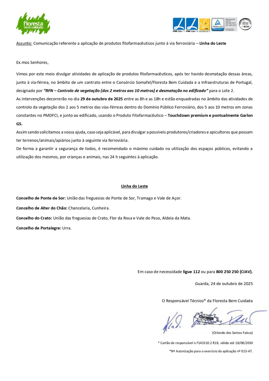No dia 29 de outubro, entre as 08h00 e as 18h00, decorrerá a aplicação de produtos fitofarmacêuticos, nas vias-férreas dentro do Domínio Público.