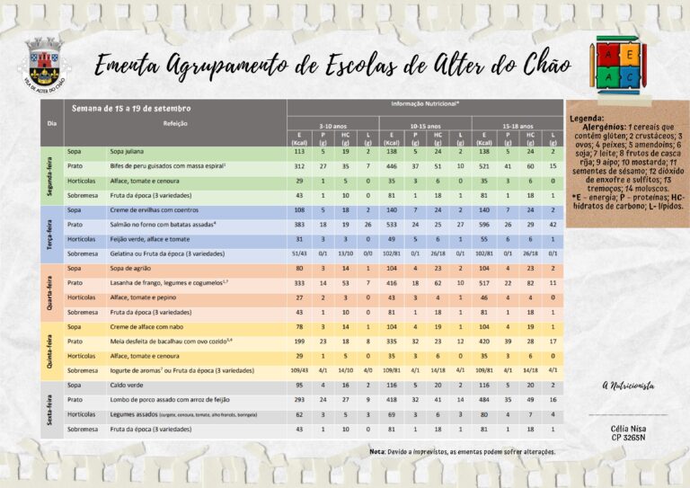 Informam-se todos os encarregados de educação do Agrupamento de Escolas de Alter do Chão que, devido a um imprevisto, no próximo dia 17 (amanhã) e 19 de setembro, haverá alteração à ementa prevista.